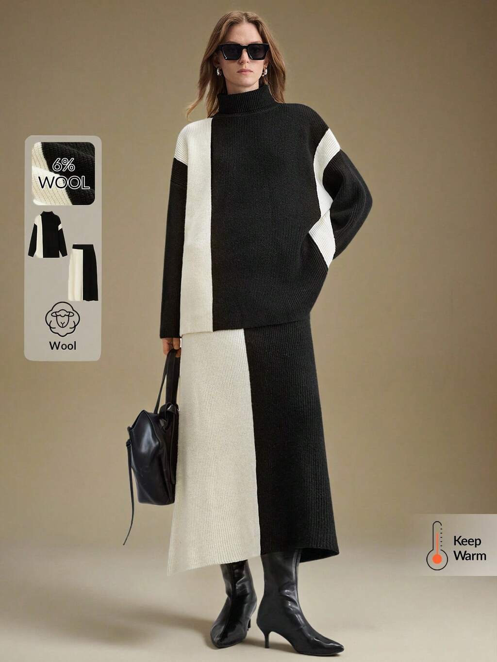 Women's Casual Colorblock Turtleneck Sweater And Knit Skirt 2 Pieces Set, Autumn/Winter,Fall,Fall Clothes For Women,Winter Clothes For Women