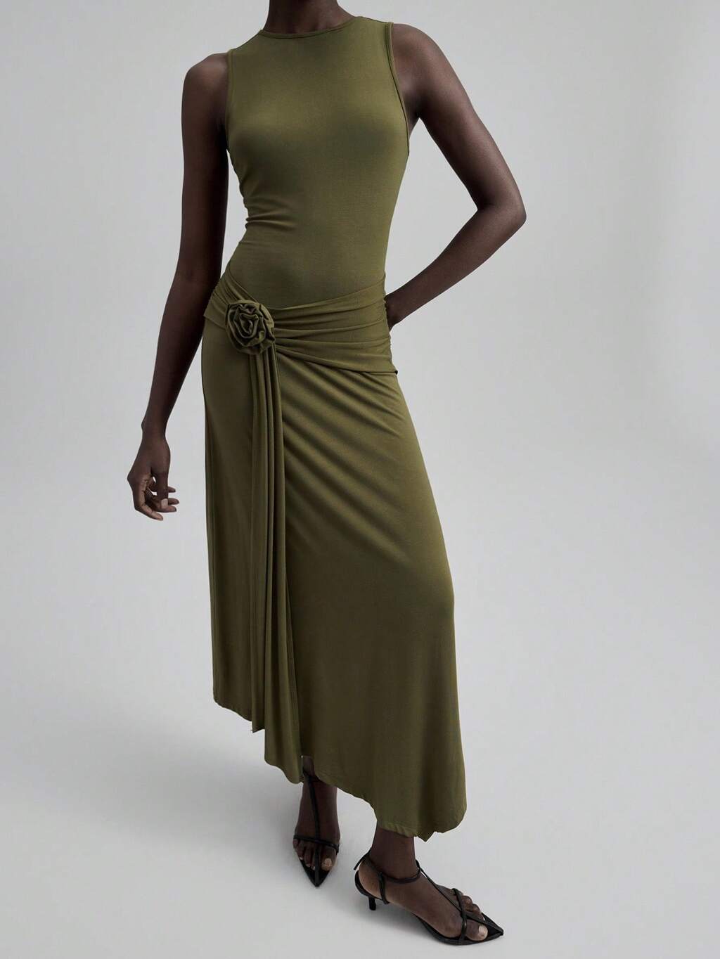 2025 Women's New Autumn Clothing, Retro 2000s Countryside Vibe, Office Business Casual Dress With Solid Color 3D Floral Decor And Pleated Details, Sleeveless Mid-Length Dress, Suitable For School, Dates, Outings, Airports, Parties