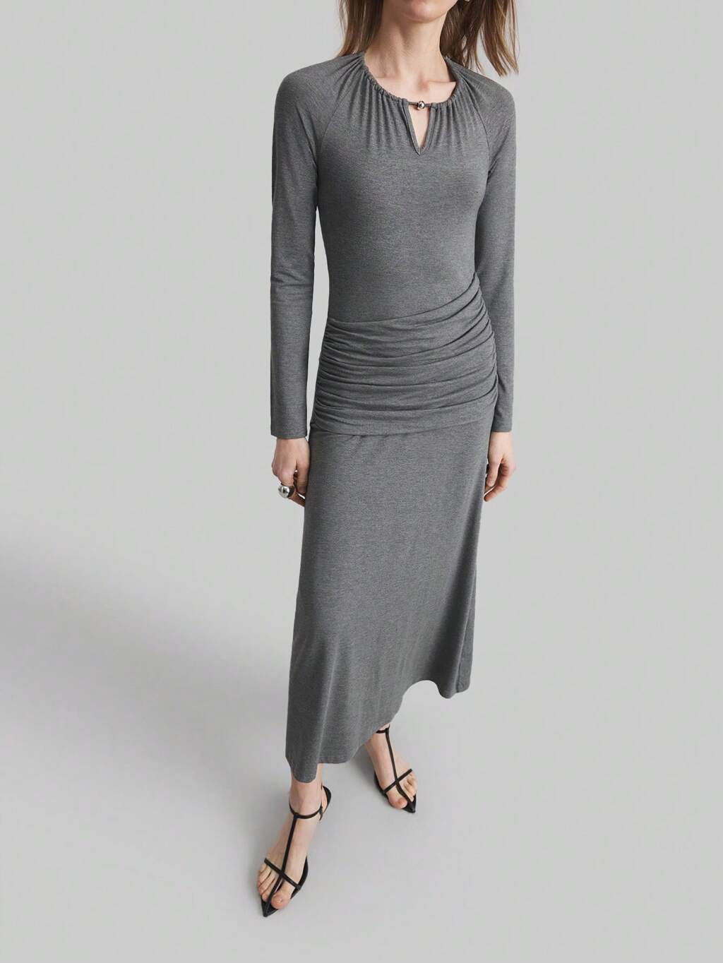 Women's Long Sleeve Halterneck Draped Long Dress, Elegant Pleated Fitted Dress