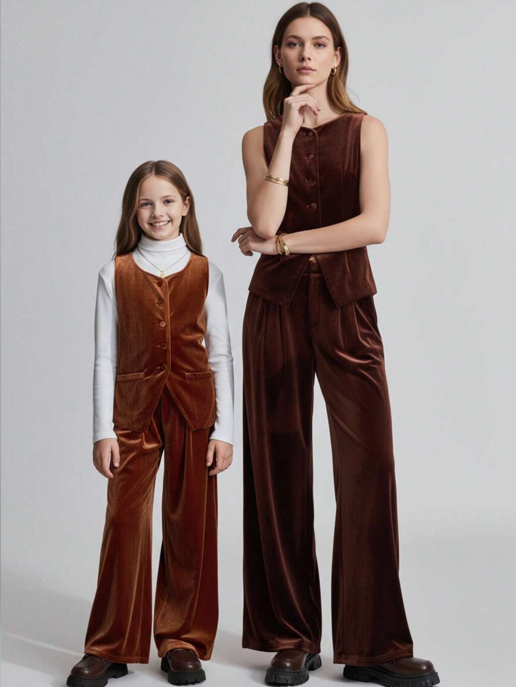 Tween Girl Brown Velvet Crew Neck Cardigan And Wide Leg Pants Set