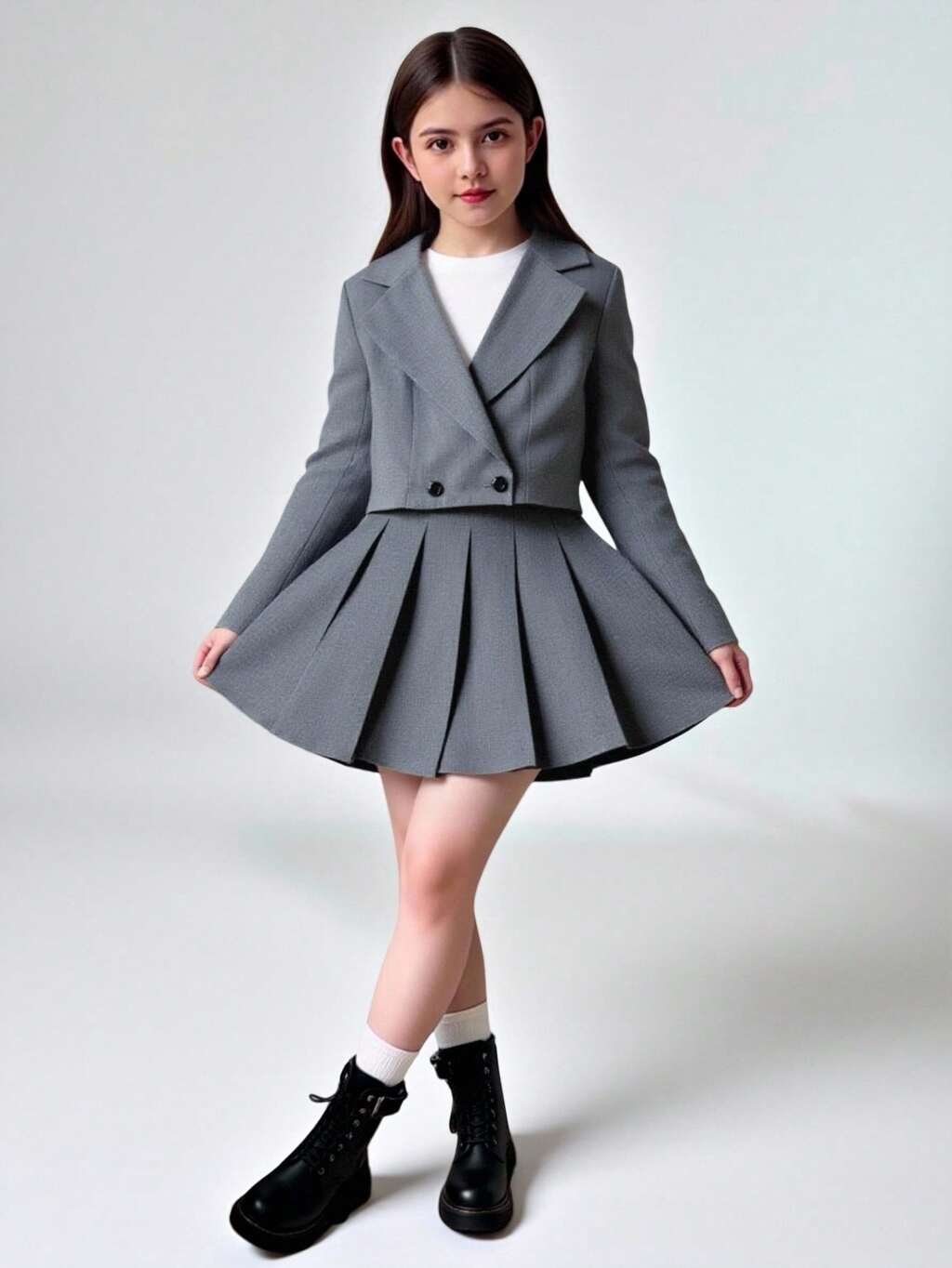 Tween Girl Notched Collar Double-Breasted Blazer & Pleated Skirt 2 Pieces Set Teen Skirt Suit Blazer Suit For Teen Girl Fall Winter