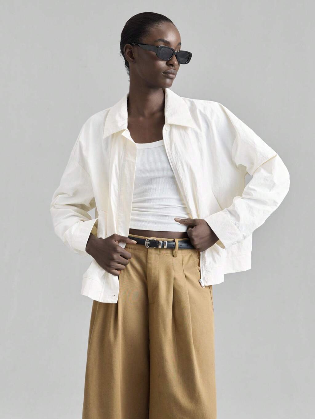 Women's Oversized White Jacket, Urban Chic Style, Lapel Collar, Long Sleeve, Casual Zip-Up Jacket With Pockets, For Everyday Wear, Commuting, Autumn Business Casual Women's Office Low-Key Old Money Style Effortless Temperament High-End Urban Commuting High-Quality Airport Women's High-End Material Elegant And Intellectual Female Wedding Guest And Beautiful French Slouchy High-End Sense Of Intelligence And Elegance Old Money Style