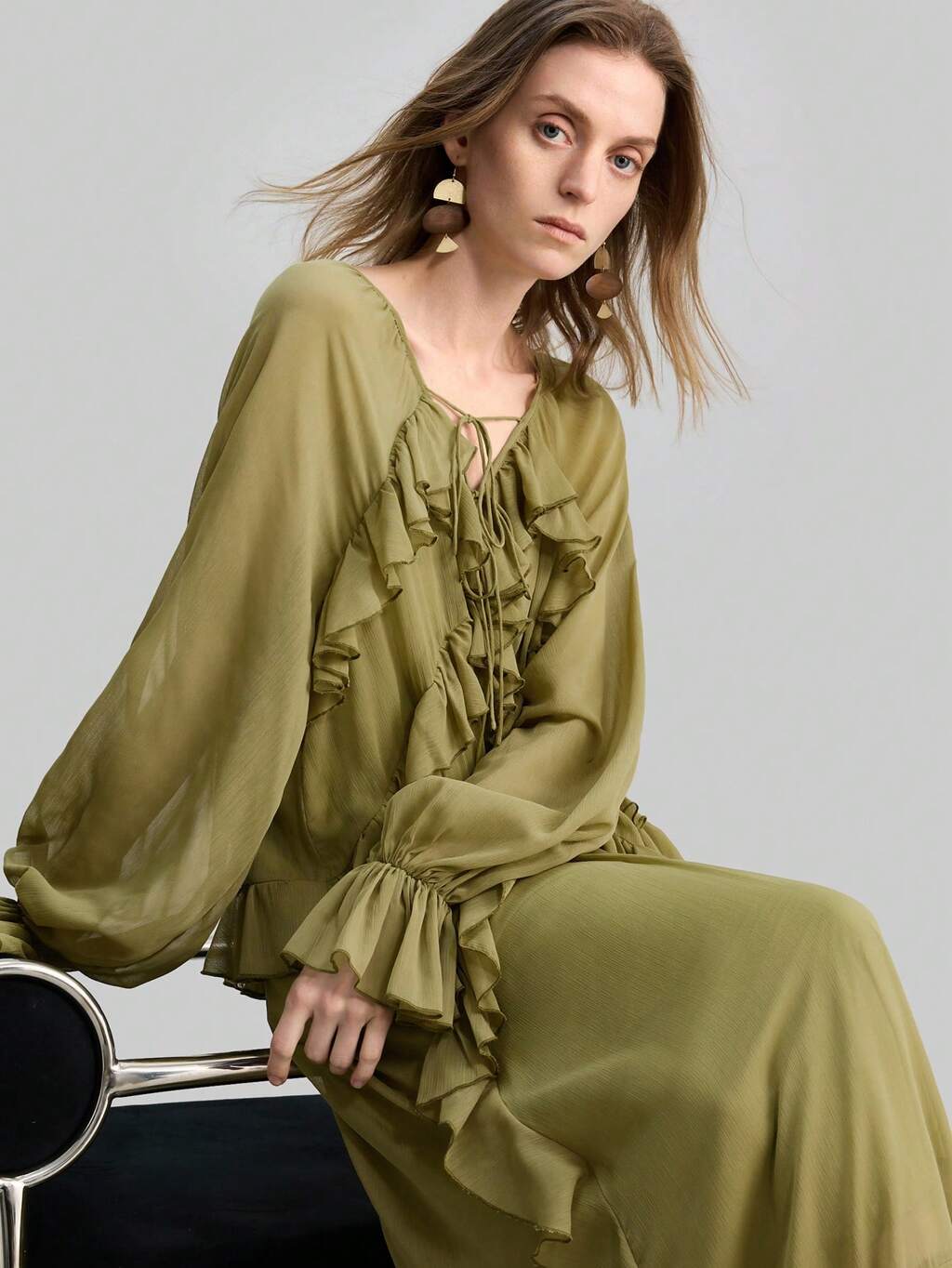 Women's Bohemian Style Dress, Chiffon Fabric With Ruffle Hem Decoration, Flowy And Comfortable, Elegant Green Long Dress, Suitable For Beach, Vacation, Boho Style