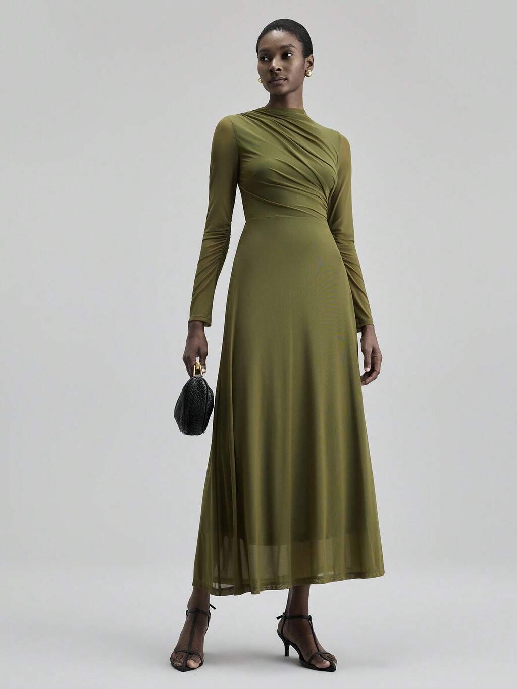 2026SS Spring/Summer Women's Extra Long Dress, Minimalist High-End Design Versatile For Daily Wear, Military Green, Soft Knit Fabric, Stand Collar, Slim Fit, Women's Long Dress, Business Casual, Office Commute, Daily Wear, Korean Style, Designed, Suitable For 5-15°C, Holiday, Party, Wedding Guest, Women's Office Wear, Best-Selling Solid Color Versatile Women's Extra Long Dress