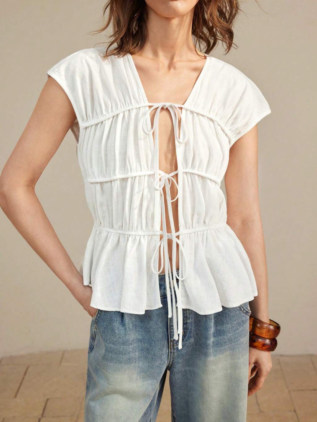 2025 Women Summer Solid Color Pleated Front Tie Casual Blouse Shirt, Minimalist Elegant White Butterfly Collar Top, Urban Commuting, Graceful Summer, Versatile, Loose & Comfortable
