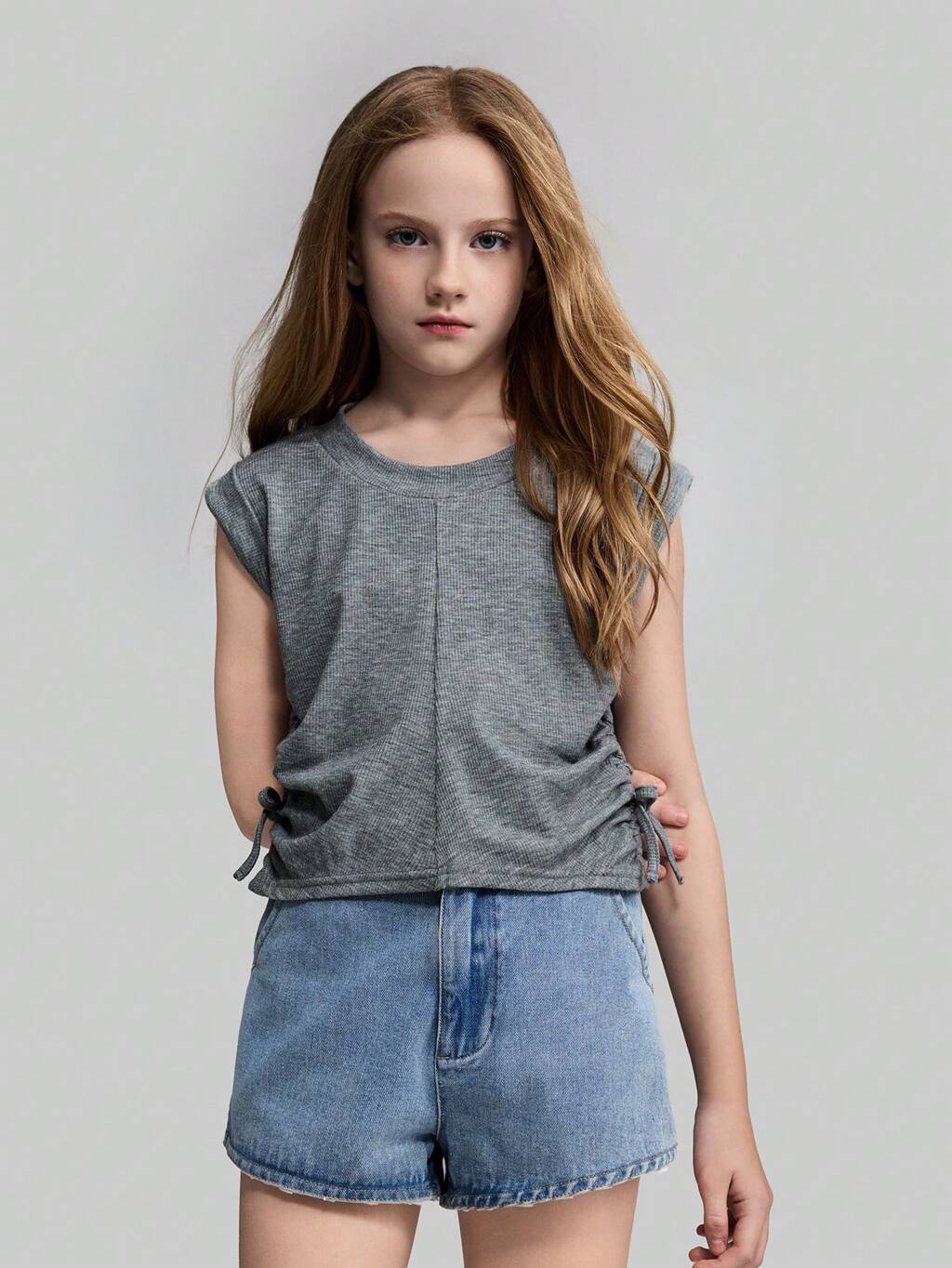 Tween Girl Simple Casual Fashionable Rolled Cuff, Waist Draw Pleat Design Versatile All-Match Solid Gray Short Camitop, Spring & Summer