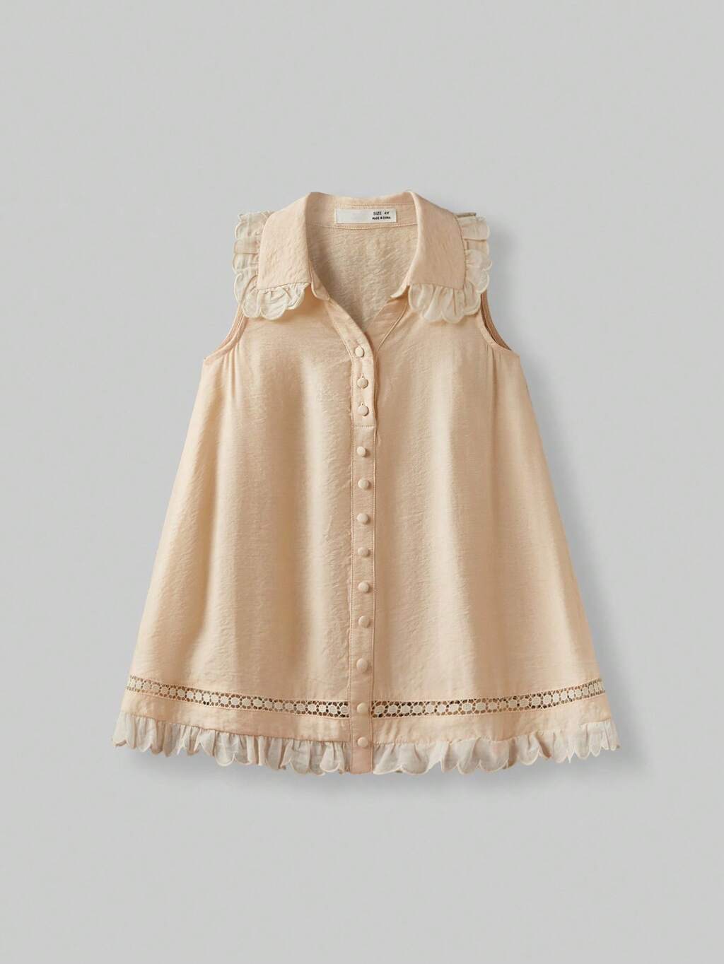 Young Girl Apricot Viscose Sleeveless Dress Featuring Elegant Ruffled Collar And Delicate Eyelet Embroidery Hem For Sweet Everyday Casual Wear, Short Length.