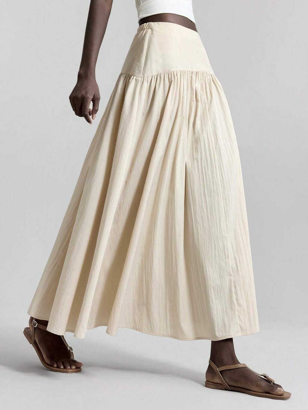 2026SS Women's Urban Solid Color Pleated A-Line Skirt, Lightweight Casual Elegant Vacation Style, Elastic Waist Ruched Long Casual Skirt For Tea Party, Vacation Party, Holiday Outfit, Fashion Versatile Women Skirt For Party, Vacation