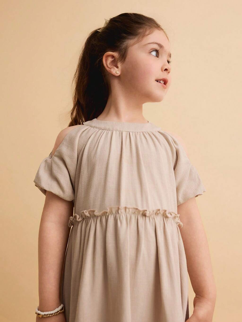 Young Girl Cap Sleeve Round Neck Ruffled Hem Dress