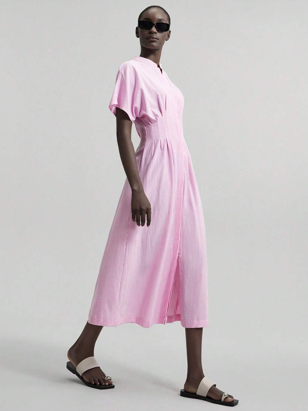 2025 New Women's Solid Color Front Button Short Sleeve Pleated A-Line Maxi Dress, Casual Vacation Summer Autumn Bright Pink Business Casual Women's Clothing, Beach Birthday Party Teacher Office Dress
