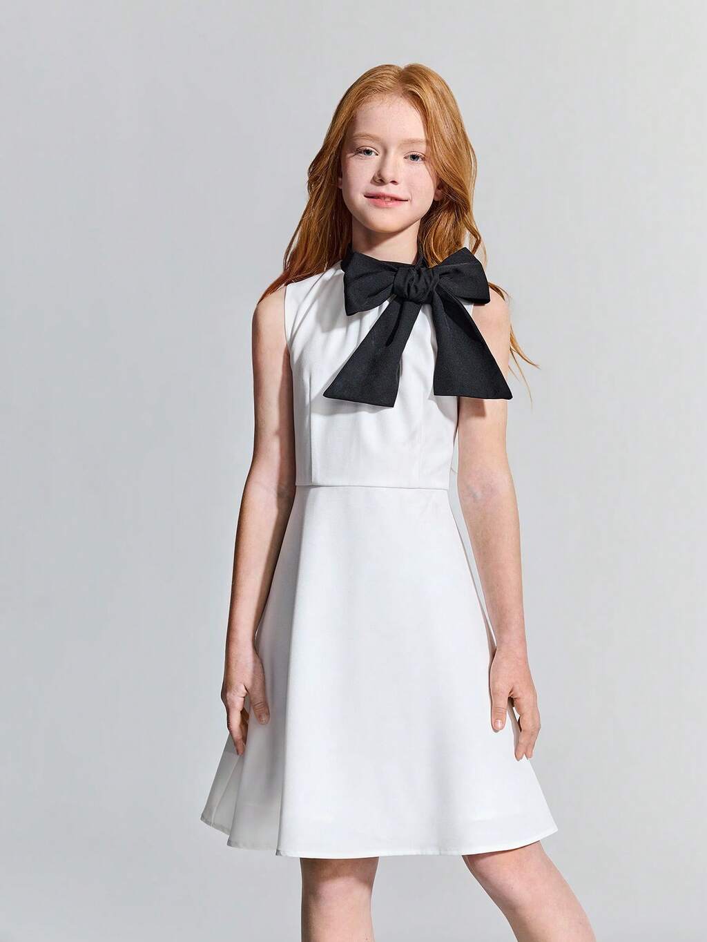 Tween Girl Woven Black & White Contrast Color Round Neck Bow Sleeveless Casual Dress