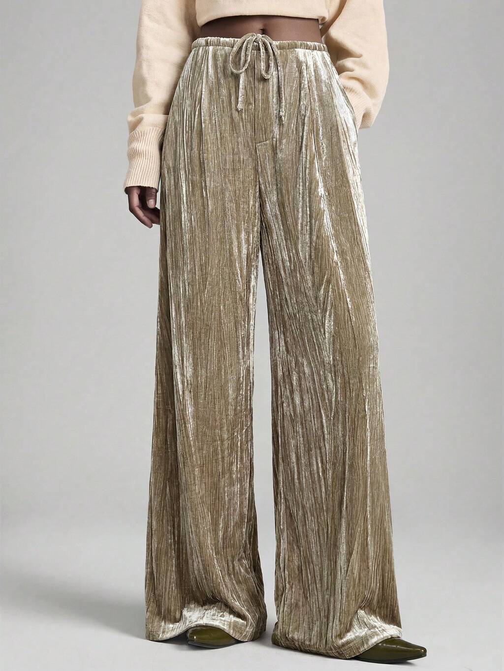 2026 Women's Pleated Velvet Fabric Comfortable Soft Straight Leg Pants With Front Pleats And Elastic Waistband, Suitable For Urban Commute, Business Casual, Elegant Attire, Wedding Guest, Party Wear, Resort Wear Modern Urban Casual Fashion Business Casual Women's Office Wear Low-Key Old Money Style Effortless Temperament High-End Urban Commuting High-Quality Airport Women's Wear High-End Material Wide Leg Pants Pleated Pants Women Wide Leg Pants Palazzo Pants Women