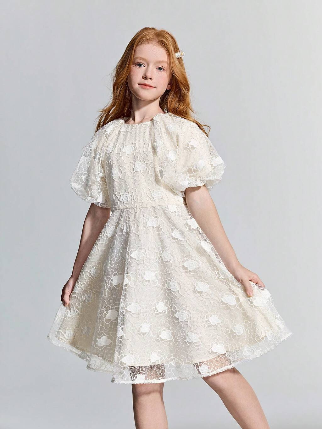 Tween Girl Apricot Lace Round Neck Petal Sleeve Bow Back Elegant Dress,Kids