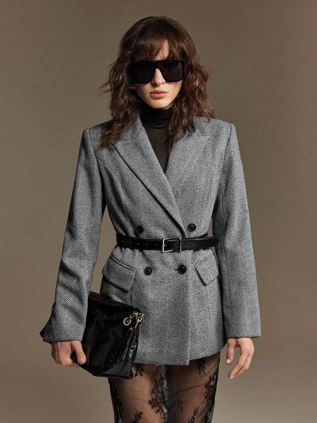 Estilo urbano moderno, marrón, mezcla de lana, tejido de tweed, cuello con muesca, manga larga, hombros anchos, bolsillos reales, blazer de corte holgado, casual de negocios, para ir a la oficina, uso diario, otoño, nueva llegada 2025