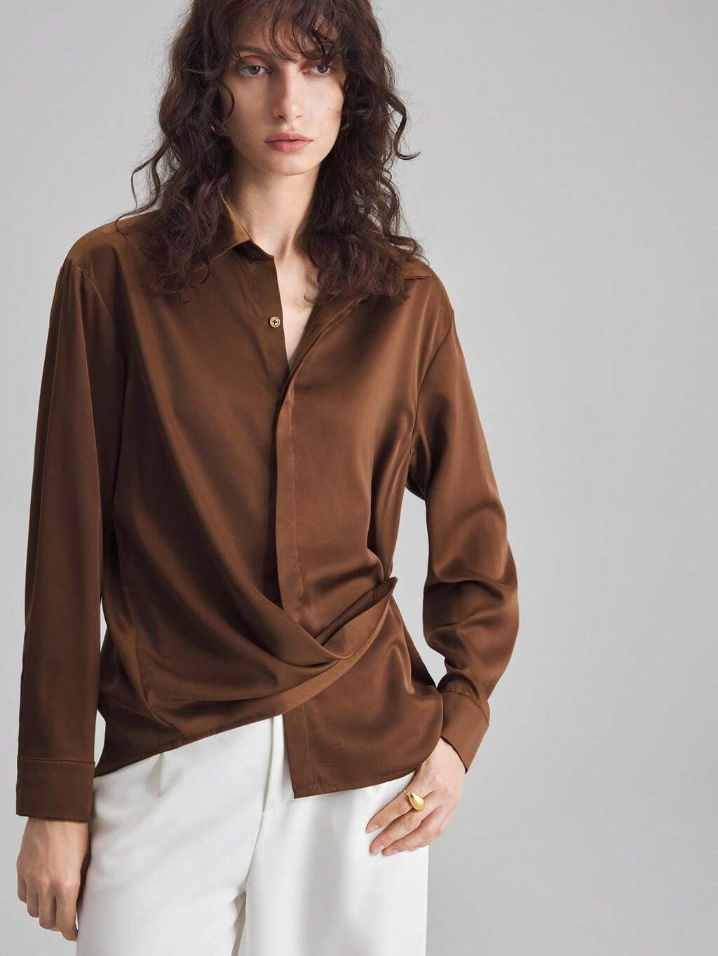 Nuevo lanzamiento de otoño 2025, adecuado para 5-15°C, tela tejida elegante, ajuste holgado con cintura anudada, conjunto de 2 piezas para mujer, camisa de manga larga + falda, casual de negocios, para ir y venir, uso diario, marrón, conjunto de otoño