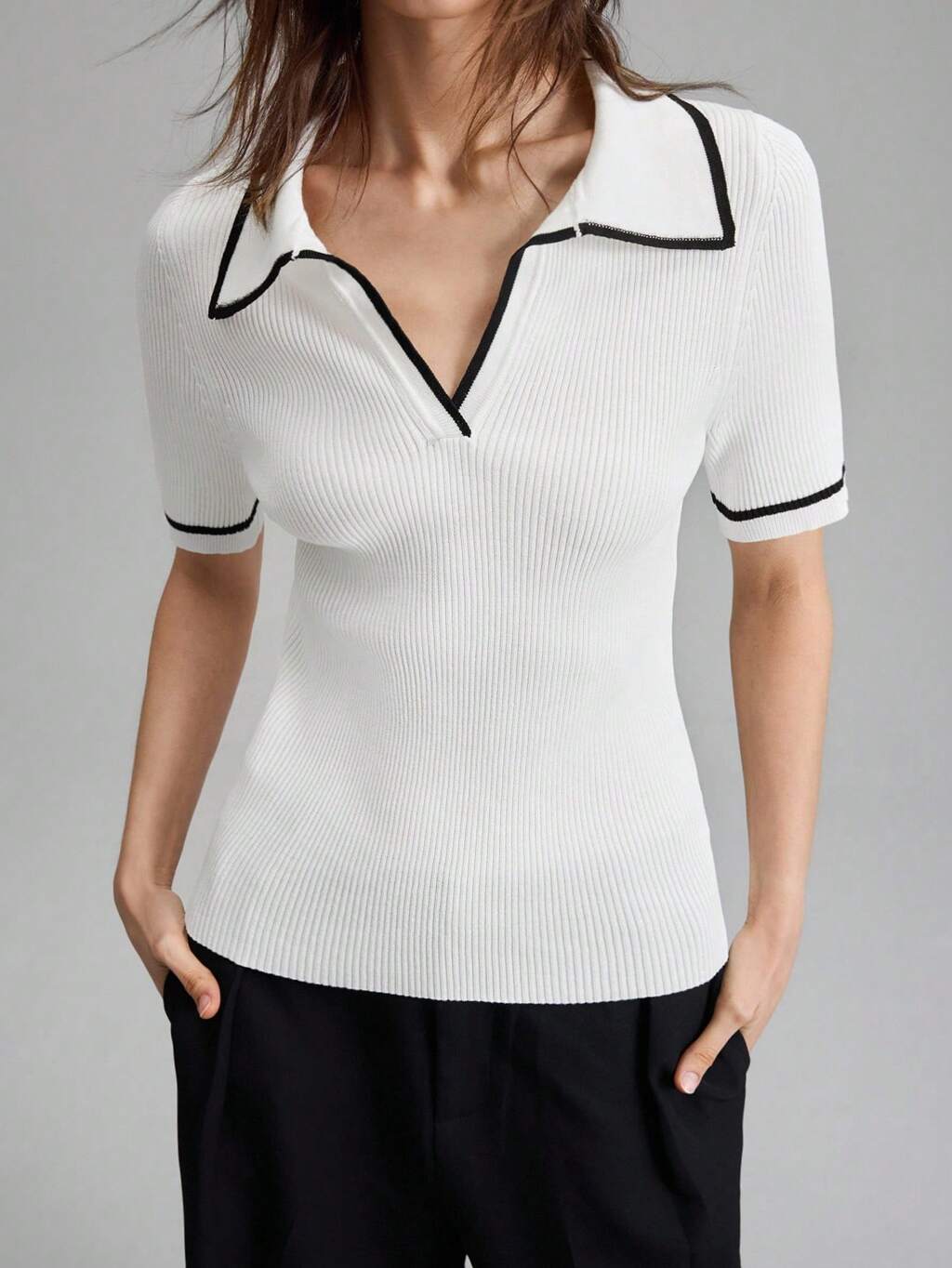 Ropa de temporada otoño/invierno 2025, regreso a clases, atuendo de Halloween, Navidad, uniforme de maestra, ropa para salir de noche, blusa de punto casual de negocios, polo de contraste negro y blanco, suéter de punto