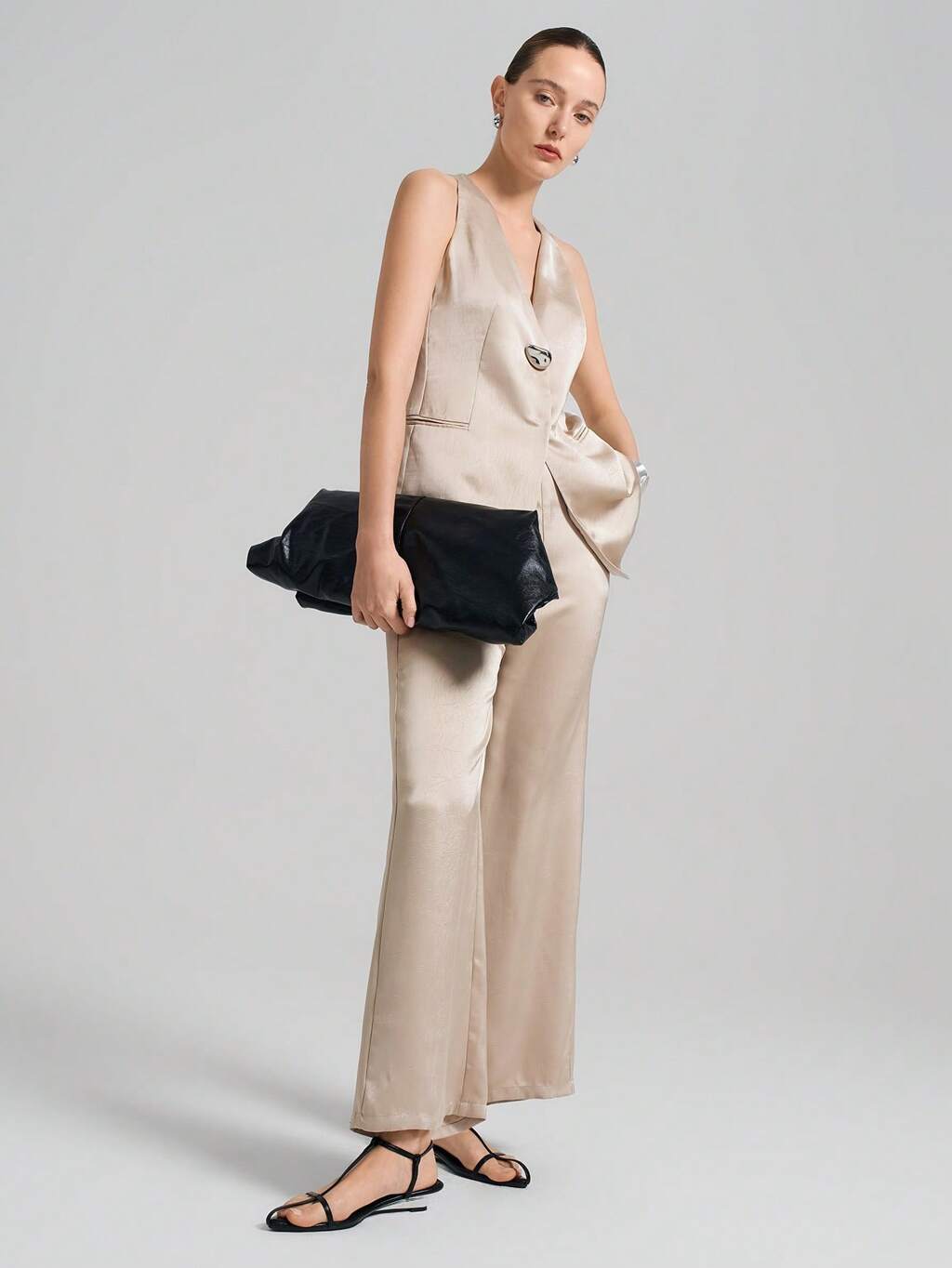 Conjunto de 2 piezas para mujer de verano, elegante, con chaleco de cuello en V y pantalones. Traje simple, de moda urbana, elegante para ir al trabajo. Conjunto color rosa champán, delgado y cómodo, con botones metálicos asimétricos. Adecuado para el verano, como atuendo para el Día del Maestro o para una fiesta.