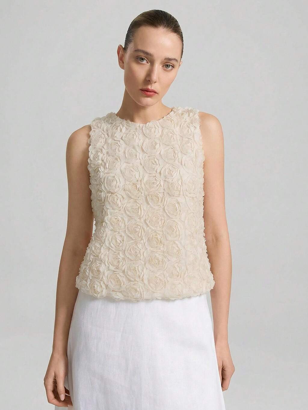 Canotta da donna con fiori tridimensionali rosa in rete, dal design con collo rotondo, canotta alla moda e versatile per l'uso quotidiano